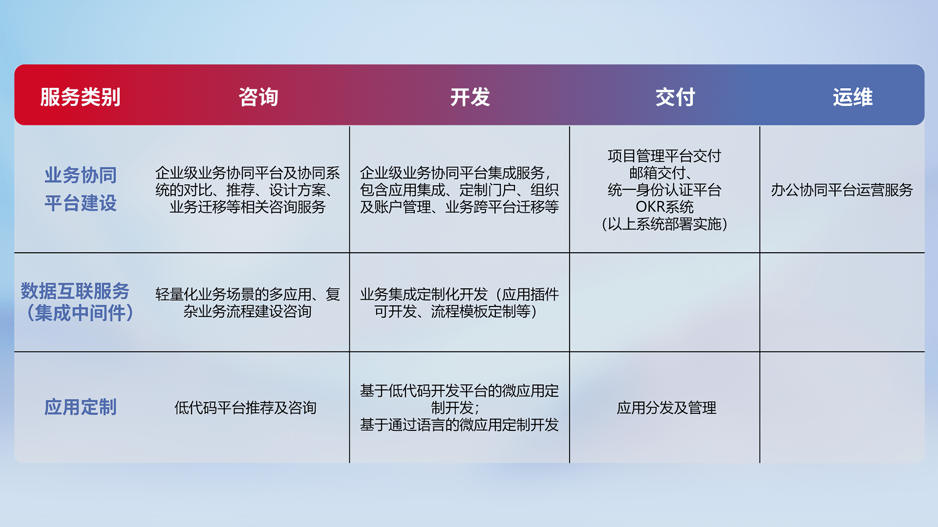 针对钉钉、、、、企微、、IDaas等平台级产品提供产品的规划、、、、方案、、交付、、定制化开发等服务,,,实现如统一协同办公、、智能客户服务、、、、混合会议管理、、智能数据查询、、、、等业务场景,,,,实现数字化转型。。。。
